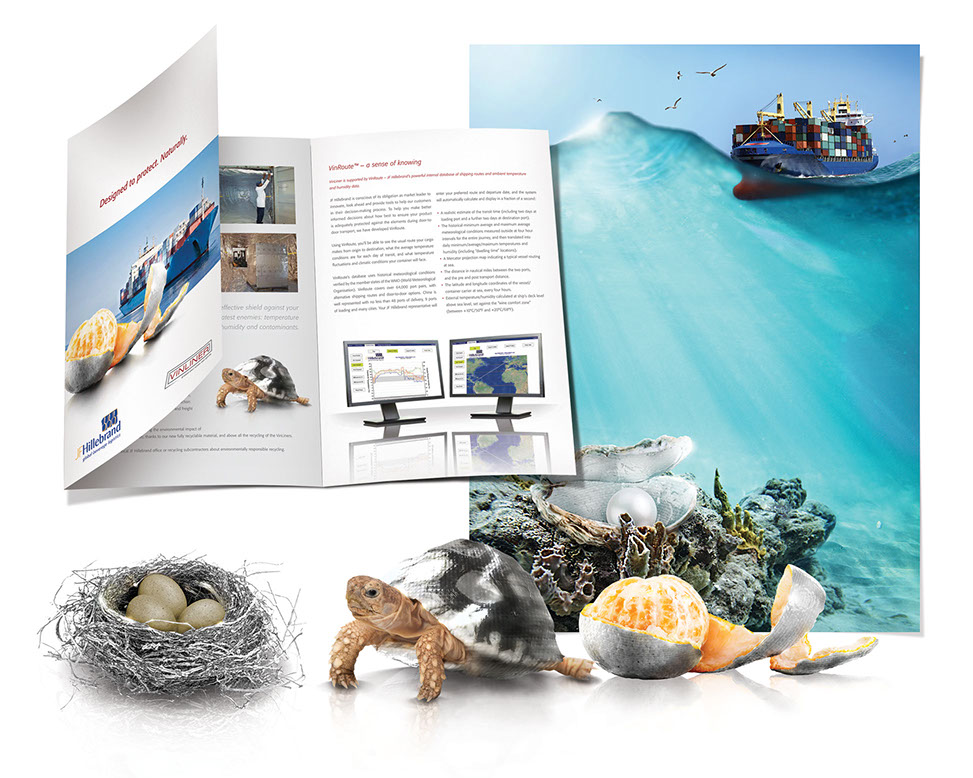 The skin of an orange, the shell of a tortoise, the shell of an oyster and a bird nest, were all made to visually add to the VinLiner protection message.